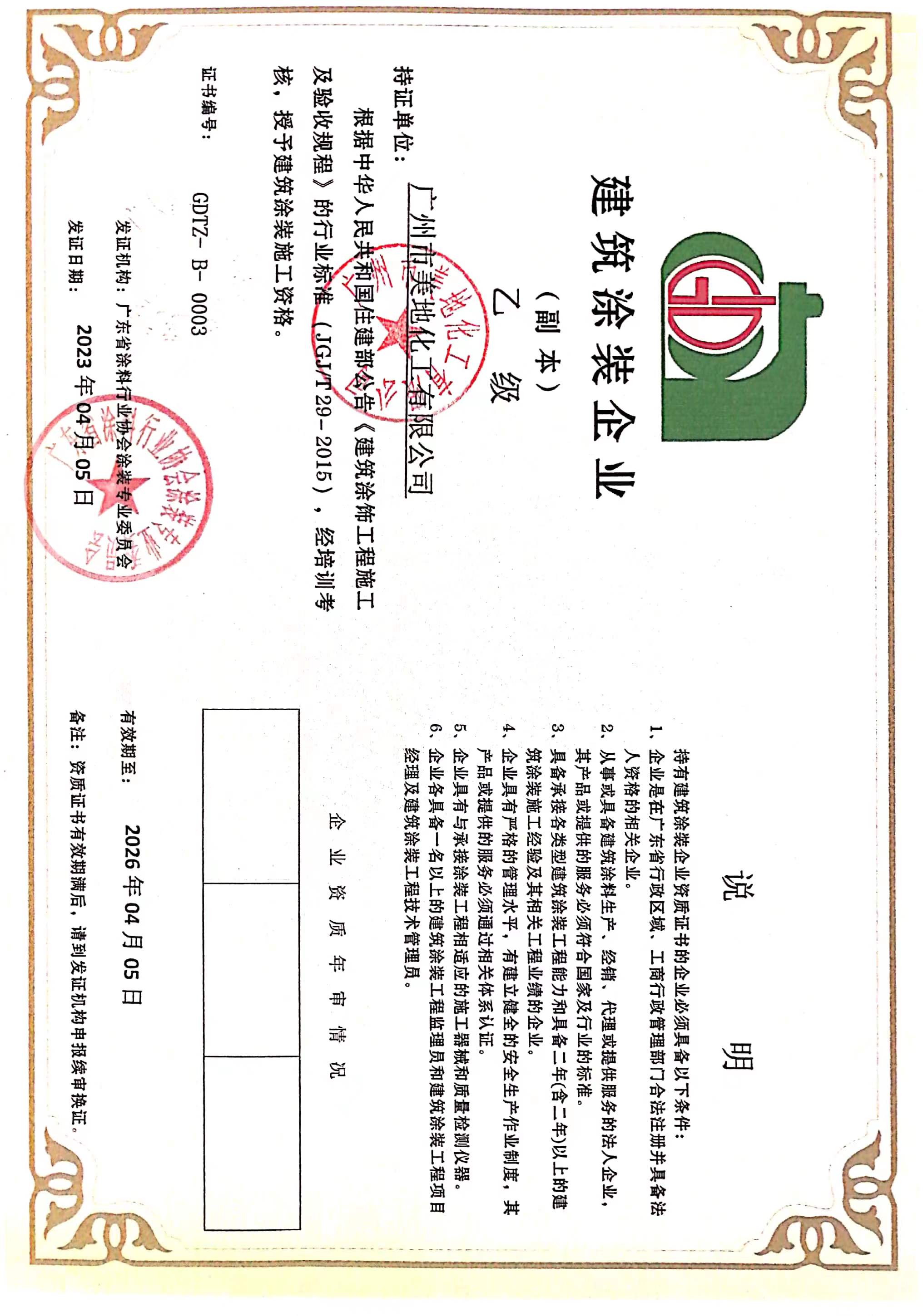 廣州美地于2017年4于5日榮獲建筑涂裝企業乙級資質證書,證件編號:GDTZ-B-0003.此次證書的獲得表明美地美地坪漆公司成為了廣東省涂料行業內具有建筑行業裝修資質和安全聲場許可證的地坪漆廠家。